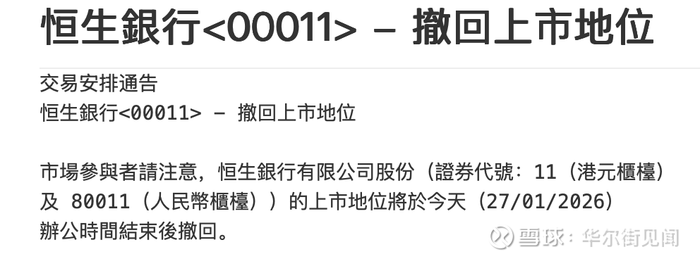 1月27日,恒生银行公告已撤回其在香港联合交易所的上市地位。