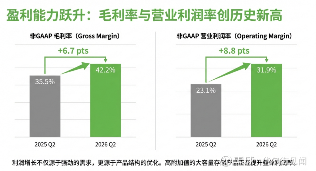 财报显示,希捷二季度营业利润率达到31.9%(非美国通用会计准则),较上年同期的23.1%提高8.8个百分点。公司非GAAP毛利率达到42.2%,较去年同期的35.5%提升了6.7个百分点。这两个数字都创下了公司历史新高。
