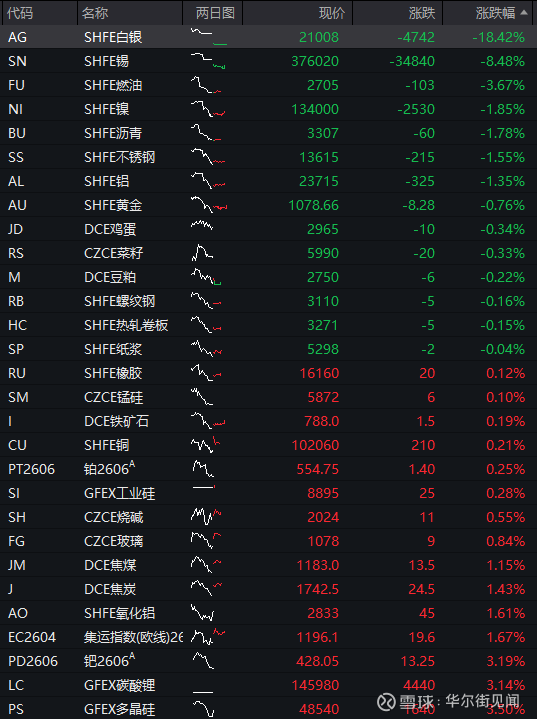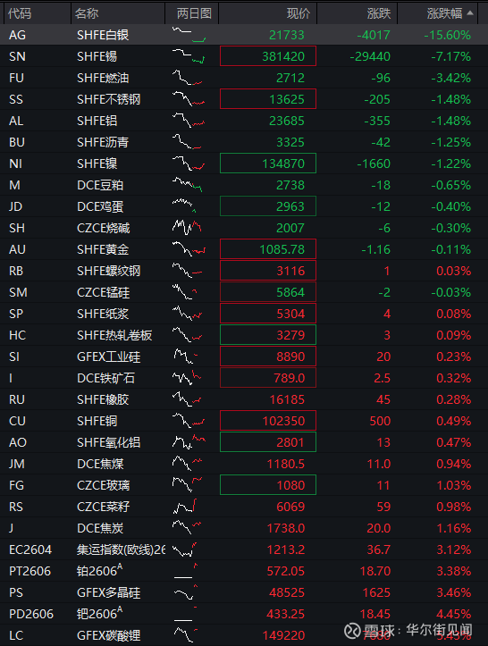商品:国内商品期货分化,截至发稿,沪银跌超15%,沪锡跌7%,燃油跌超3%,不锈钢、沪铝、沥青、沪镍跌超1%,豆粕、鸡蛋、烧碱、沪金下跌,螺纹钢、锰硅、纸浆、热轧卷板、工业硅、铁矿石、橡胶、沪铜、氧化铝、焦煤等上涨,玻璃、菜籽、焦炭涨1%,集运指数、铂金、多晶硅涨超3%,钯金涨超4%,碳酸锂涨超5%。