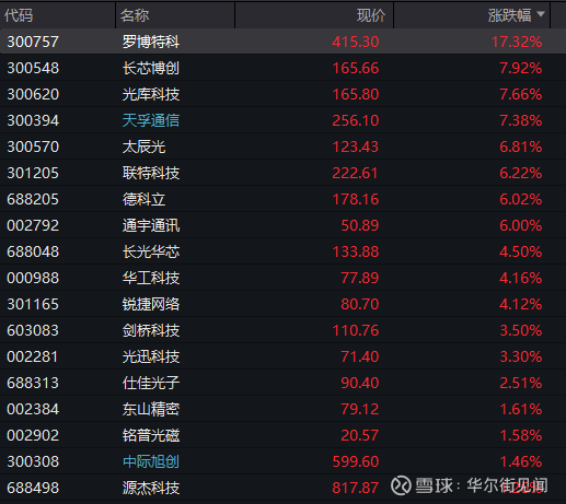 算力硬件股反弹,CPO、光芯片等方向拉升,其中罗博特科涨17%,长芯博创、光库科技、天孚通信涨超7%,太辰光、联特科技、德科立、通宇通讯涨6%。