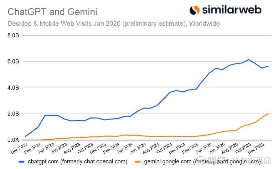 与此同时,Gemini继续保持强劲增长势头。根据1月份的初步估计,Gemini的流量环比增长17%。这一增长轨迹显示,谷歌正在利用其在搜索和移动生态系统中的优势,成功将用户导向其AI产品。