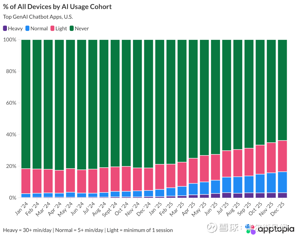 数据显示,Apptopia测量的大多数设备从未使用过聊天机器人,这意味着市场仍有巨大的增长空间。早期采用者的热情在ChatGPT发布后的几年里推动了生成式AI的发展,但要实现大规模普及仍需时间。
