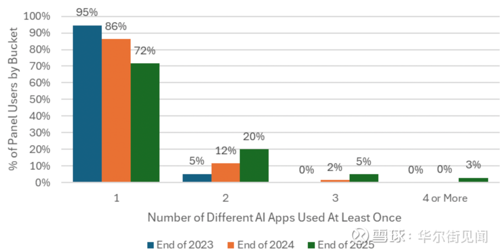 数据显示,到2025年底,20%的聊天机器人用户至少使用两款应用,而2023年底这一比例仅为5%。这表明用户正在根据不同需求选择不同的AI工具,而非局限于单一平台。