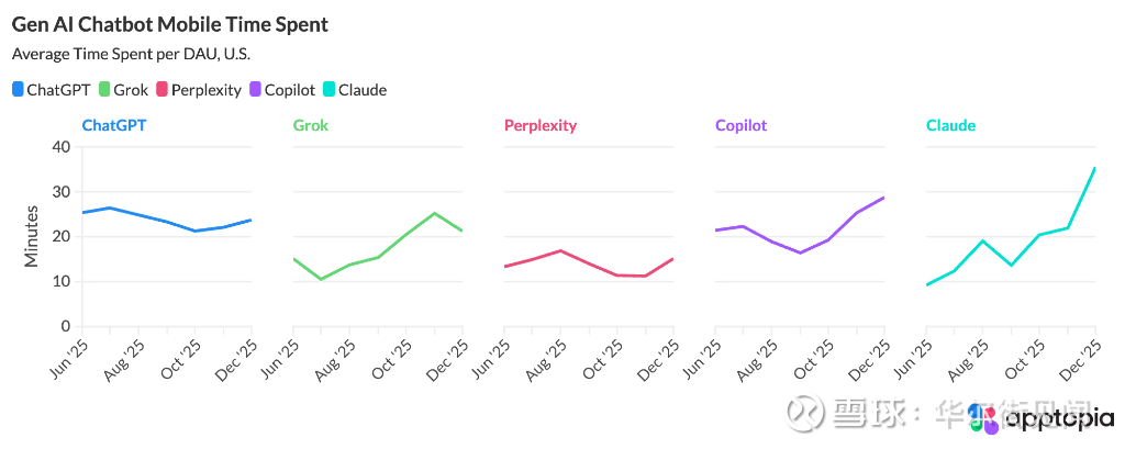 尽管Anthropic的Claude在用户数量上远不及ChatGPT或Gemini,但用户在其上花费的时间大幅增长,从2025年6月的日均约10分钟激增至目前的30分钟以上。