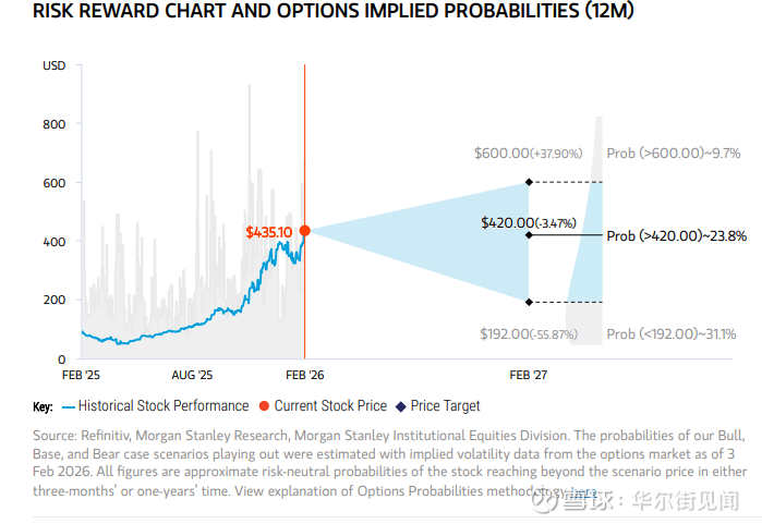 大摩将目标价从350美元上调至420美元。这一目标价是基于2027日历年(CY27)预估每股收益15美元的28倍市盈率得出的。