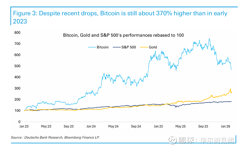 尽管近期跌幅显著,比特币较2023年初仍上涨约370%。德银指出,当前调整更多反映的是过去两年投机性涨幅的回撤,而非基本面的崩溃,但加密市场正面临从"信仰驱动"向"价值锚定"的艰难过渡。