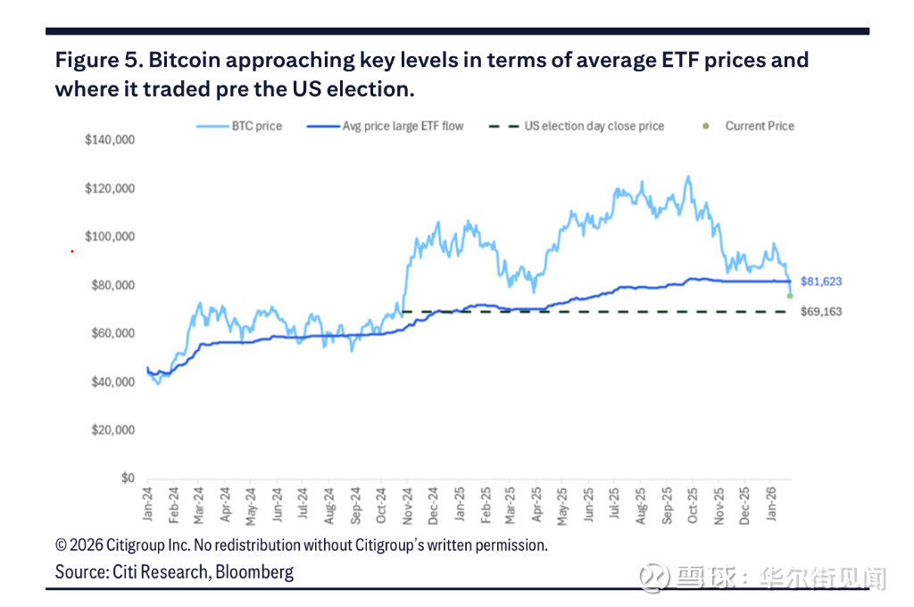 关键价格水平临近比特币正在测试两个被市场密切关注的技术水平。花旗研究指出,第一个是ETF平均入场价格81600美元——以最大ETF每日收盘价计算的平均水平。比特币目前已跌破该水平,意味着平均持有者已处于亏损状态。