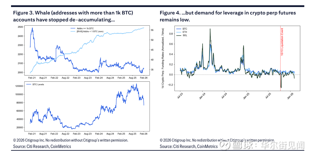 期货市场仍存在多头清算的空间。尽管自去年10月大幅上涨以来已经历多轮清算,花旗数据显示,交易所仍在发现多头头寸被平仓。对加密货币永续期货的杠杆需求仍然低迷。
