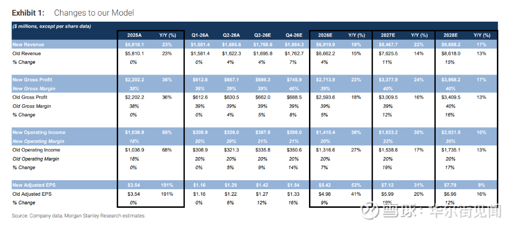 摩根大通因此上调了对公司2026和2027财年的营收增长预期,分别从十几的百分比增长上调至接近20%和20%以上,并预计2027自然年的每股收益将超过8美元。