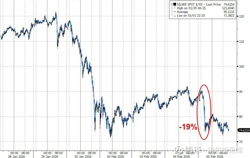 过去一周现货白银已从1月29日创下的历史高点回落超过40%。周四白银暴跌19%,已抹去了今年以来的所有涨幅,市场动荡程度前所未有,堪称1980年以来之最。