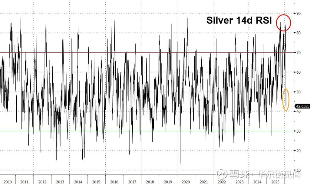 2025年12月12日:宣布第一次提保,初始保证金从22,000上调至24,200。 2025年12月29日:第二次提保,初始保证金从24,200上调至25,000。 2025年12月31日:第三次提保,力度加大,从25,000大幅上调至32,500。 2026年1月28日:第四次提保,改为百分比制,从9%上调至11%(高风险类别从9.9%上调至12.1%)。 2026年1月31日:第五次提保,继续加码,从11%上调至15%(高风险类别从12.1%上调至16.5%)。技术指标来看,白银目前暂时未达到“超卖”状态。