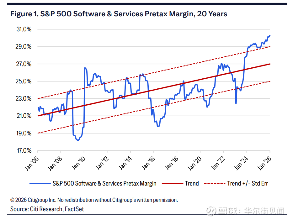 利润率见顶风险:从历史高位回归均值研报数据显示,软件与服务行业的税前利润率已达到历史高位(约30%),这一因素此前已被充分甚至过度地计入估值中。花旗警告,一旦利润率回归趋势线或跌破趋势线,估值将面临重创。