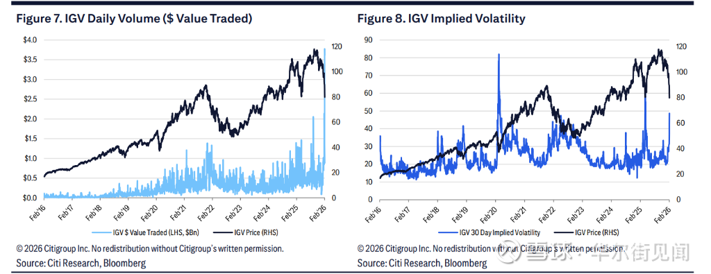 在交易层面,花旗监测到主要软件ETF(如IGV)的交易额和隐含波动率均出现飙升。这种极端的交易活动通常是“抛售高潮”的特征。花旗策略师认为,这种恐慌性抛售可能预示着价格走势将进入一个更稳定的时期,甚至出现短期反弹。
