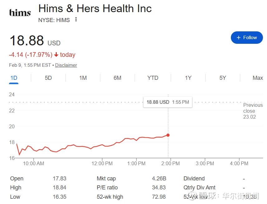 诉讼消息公布当天,Hims股价本周一盘初曾跌近29%,午盘跌幅收窄到20%以内。
