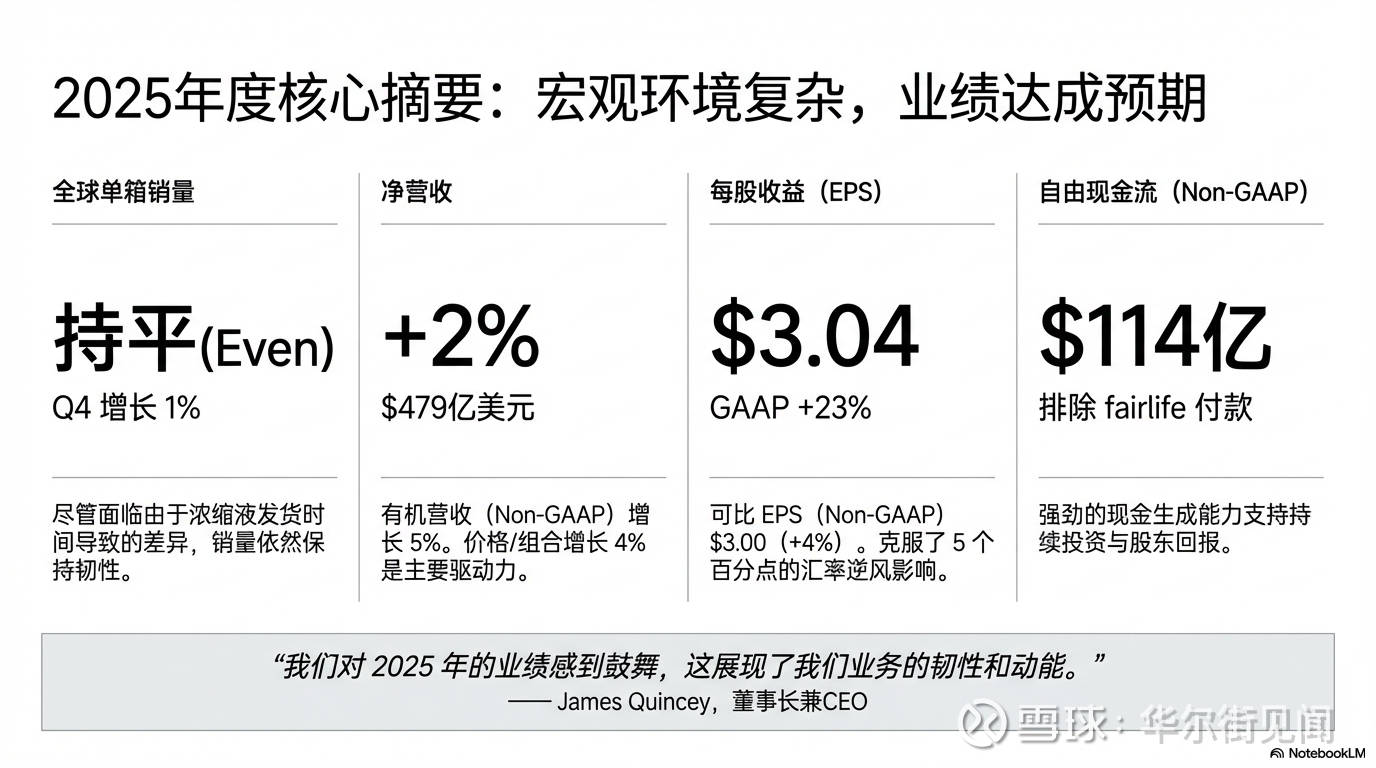 2026年指引逊于预期,增长回归常态化本次财报最令投资者担忧的是2026年的业绩指引。可口可乐预计2026年有机收入增长为4%至5%,而分析师此前普遍预期增长均值在5%以上。对于每股收益,公司预计在2025年3.00美元的基础上,可比每股收益将增长7%至8%(包含约3%的汇率顺风),这暗示着公司正在从过去几年高通胀带来的“提价繁荣”回归到更温和的增长常态。