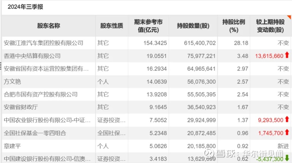 2024年四季度,江淮汽车股价表现强势。截至2024年底,章建平从前十大股东名单中消失,方文艳则大举减仓2597万股;2025年一季度,方文艳也从江淮汽车前十大股东名单中消失。