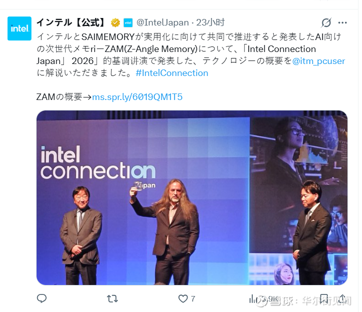 软银子公司SAIMEMORY于2月3日在Intel Connection Japan 2026活动上首次展示了ZAM原型产品。英特尔在博客文章中透露,原型产品计划于2027年推出,全面商业化预计在2030年实现。