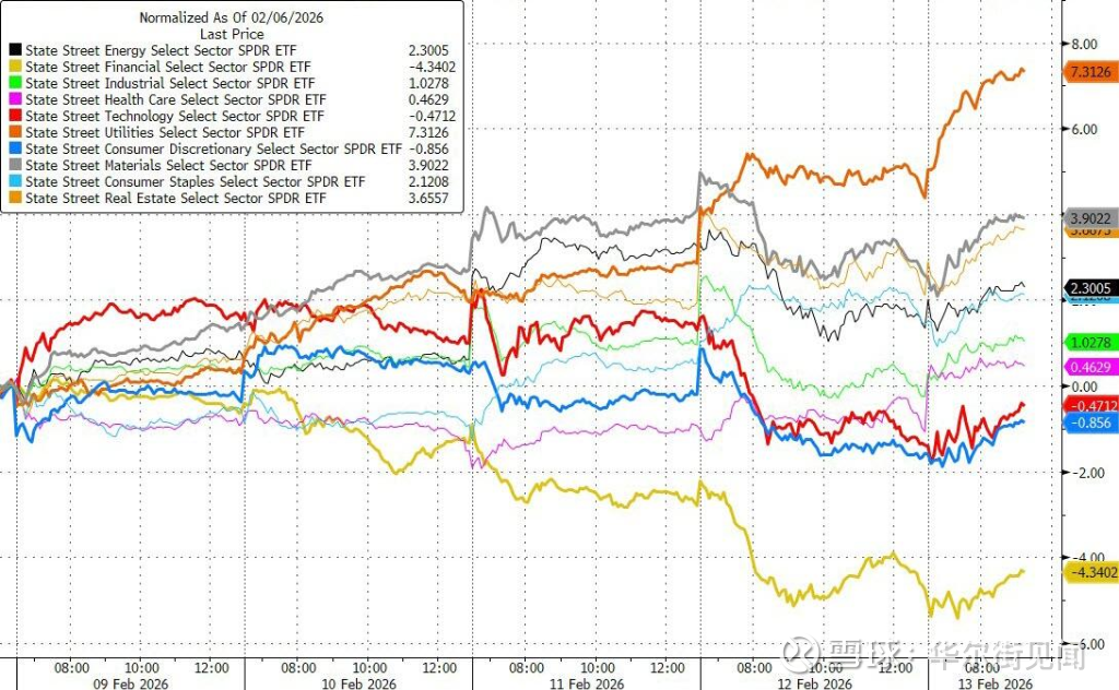 (本周美股公用事业板块作为规避AI冲击的安全港,表现大幅领先,而金融板块则成为当周表现最差的板块)