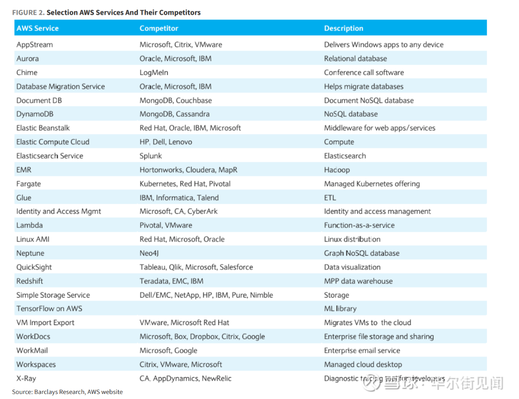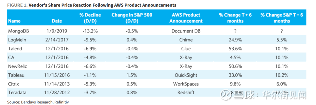 然而,巴克莱指出,这种情况让人强烈联想到10年前(注:指报告发布时间2026年回望2016年左右)。当时,随着AWS不断壮大并推出更多自有软件解决方案(如数据库服务Redshift),市场陷入了类似的恐慌。那时,每当AWS宣布推出一款新的软件产品,相关领域的成熟软件公司股价就会立即遭受重创。