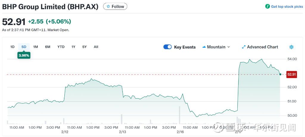 这家澳大利亚矿业巨头周二公布,截至去年12月31日的六个月内,收入同比增长11%至279亿美元,股东应占利润增长28%至56亿美元。业绩超出分析师预期,公司股价开盘上涨5.3%。