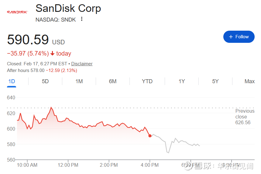 此前1月29日的西部数据季度财报电话会议上,公司首席财务官Kris Sennesael表示,计划在2月24日分拆一周年前出售剩余的750万股闪迪股份。公告发布后,闪迪股价延续周二颓势,盘后下挫超2%。