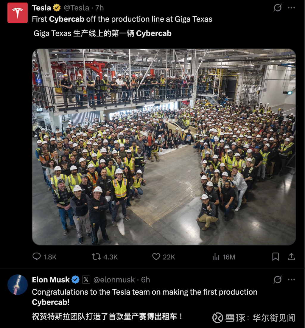 特斯拉周二在X平台宣布,首辆生产版Cybercab已在奥斯汀超级工厂下线。马斯克在社交媒体上向团队表示祝贺。该公司此前表示预计于4月启动Cybercab的生产。