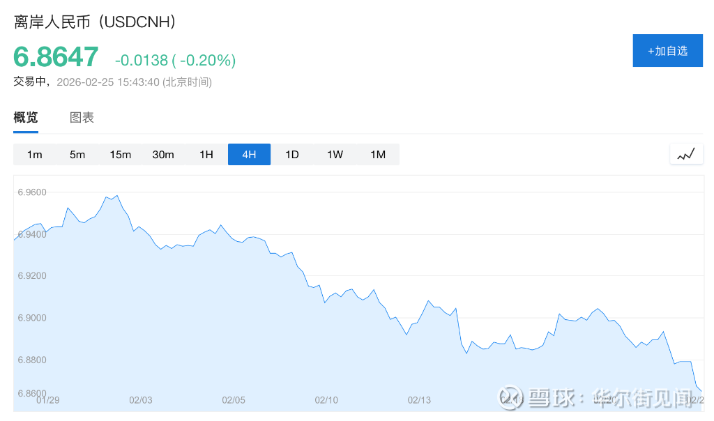 2月25日,在岸人民币兑美元升破6.87关口,报6.8658,离岸人民币报6.8628,日内涨幅均超150点。东方金诚首席宏观分析师王青将本轮升值归结为三重动力:中美经贸关系自2025年11月回稳,外部环境改善;美元持续走弱带动非美货币集体走强;以及出口企业结汇需求集中释放放大了升值节奏。
