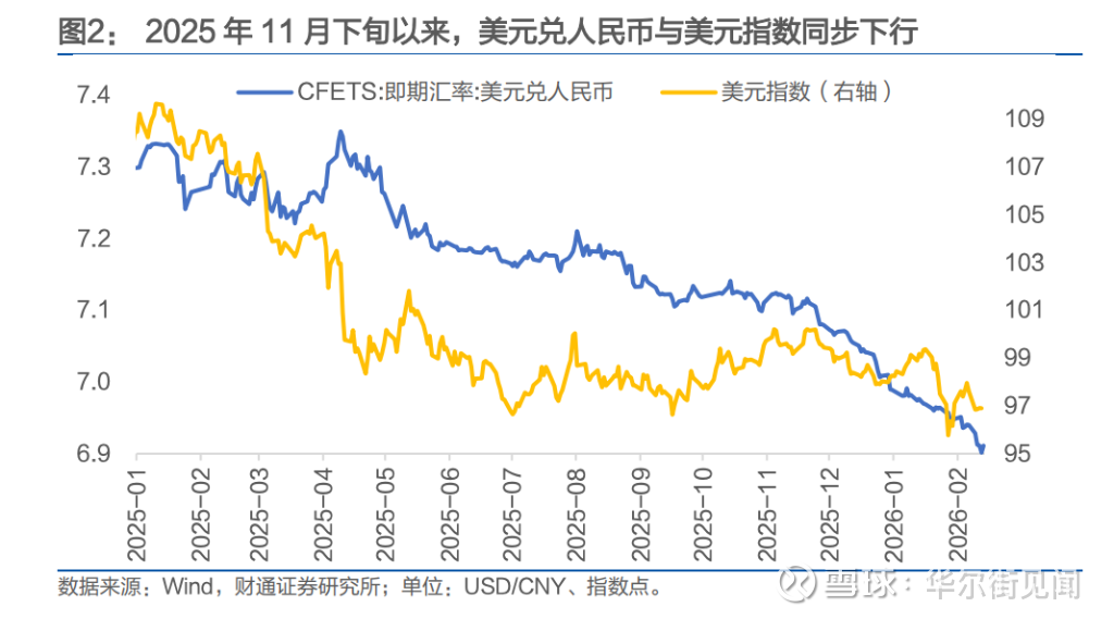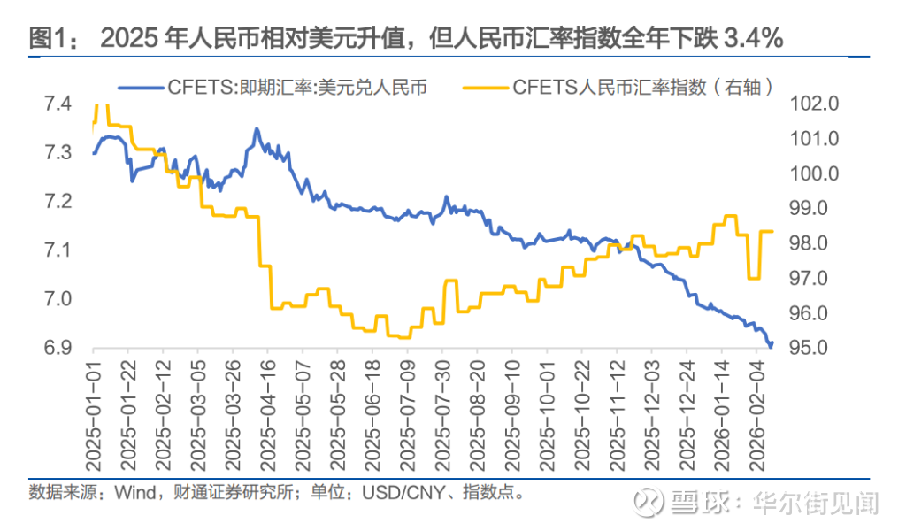 财通证券指出,2025年全年美元指数下跌9.4%,而人民币相对美元仅升值4.3%。若以人民币汇率指数衡量,人民币对一篮子货币实际全年下跌3.4%,意味着人民币整体在贬值,仅是相对美元走强。这一数据清晰表明,本轮升值的核心驱动来自美元端。