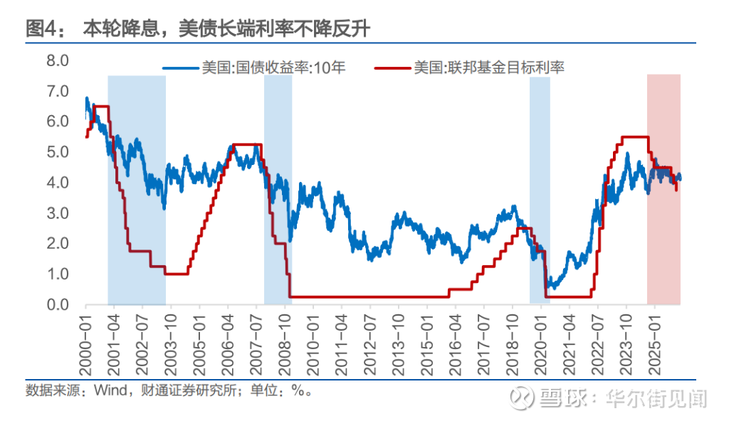 从资产表现看,本轮美联储降息周期内,10年期美债利率不降反升。自2024年9月降息启动以来,由3.73%上行至2026年2月13日的4.04%,累计上行31BP。财通证券指出,这与2001年、2007年、2019年三轮降息周期中长端利率显著下行的规律截然相反,反映市场对美元资产信心渐失,美债需向投资者提供更高信用溢价。
