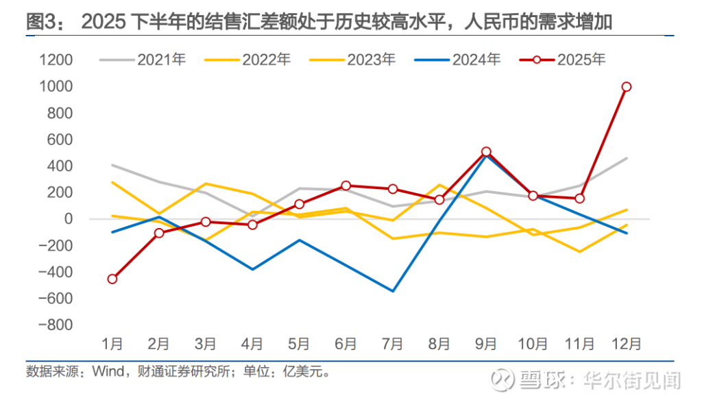 然而,2025年从9月开始结售汇差额出现超季节性增长,源自于出口企业预期未来人民币会持续升值,从而集中结汇。2025年12月的结售汇差额更是超季节性增长到1001亿美元。短期结汇激增,加速放大了人民币的升值波动。