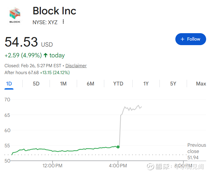 公告发布后,Block股价在盘后交易中一度上涨逾24%。