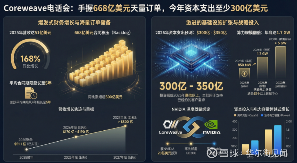 为了吞下海量的积压订单,CoreWeave预计2026年资本支出为300亿至350亿美元,超过2025年约150亿美元资本支出规模的两倍,并几乎全部与已签署客户合同直接挂钩。