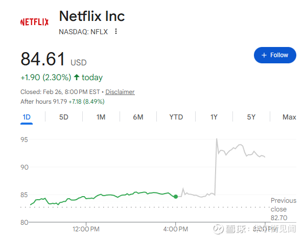 自去年9月市场传出Netflix可能竞购华纳以来,Netflix股价持续承压,市值蒸发逾1700亿美元。此次宣布退出后周四盘后交易中一度大涨10%,市场将其解读Netflix避免了以过高溢价完成一笔规模庞大的整合交易。