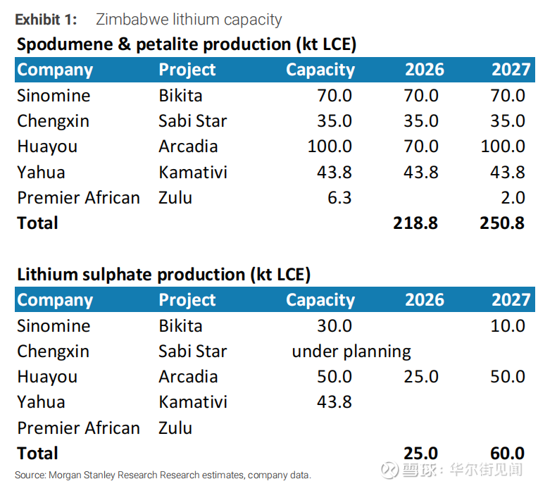 津巴布韦这道禁令,短期冲击有多大据追风交易台消息,摩根士丹利在最新的快评中把问题说得很具体:华友的Arcadia项目50kt LCE硫酸锂产能预计在2026年一季度末开始投产;中矿资源Bikita的30kt产能计划在2027年中投产;盛新锂能和雅化集团的下游加工产能仍在规划阶段。换句话说,津巴布韦当前能以硫酸锂形式合规出口的产能,2026年仅有25kt LCE,2027年才能增至60kt LCE。
