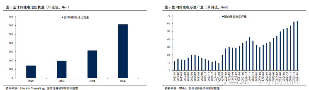 InfoLink数据显示,2025年全球储能电池出货量达612.39GWh,同比增长94.6%,四季度单季首次突破200GWh。进入2026年,这一势头没有减弱:1月国内储能电芯产量63.02GWh,环比仅增0.8%;2月受春节影响,SMM预计产量环比减少8.8%——但考虑到2月天数少且有长假,这一降幅说明开工率实际上维持在高位。