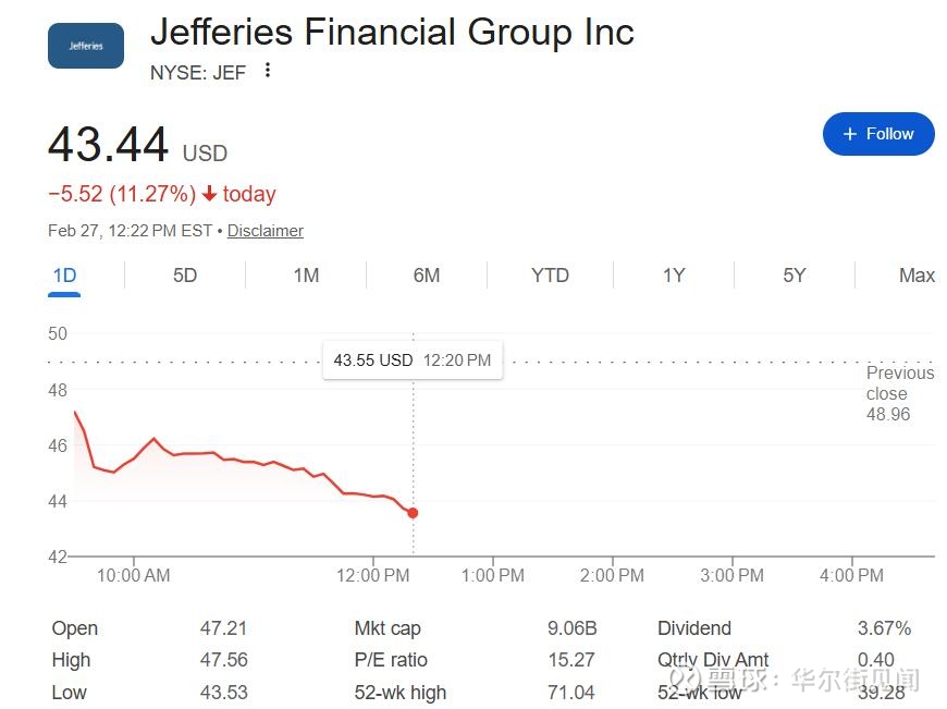 MFS破产和上述抵押品缺口的消息近两日持续冲击市场,相关机构股价重挫。本周五美股盘中,周四收跌超3%的Jefferies跌超10%;西班牙桑坦德银行的欧股盘中曾跌3.7%;伦敦上市的巴克莱英股一度跌超5%,跑输连续第三日收创最高纪录的英国富时100指数。