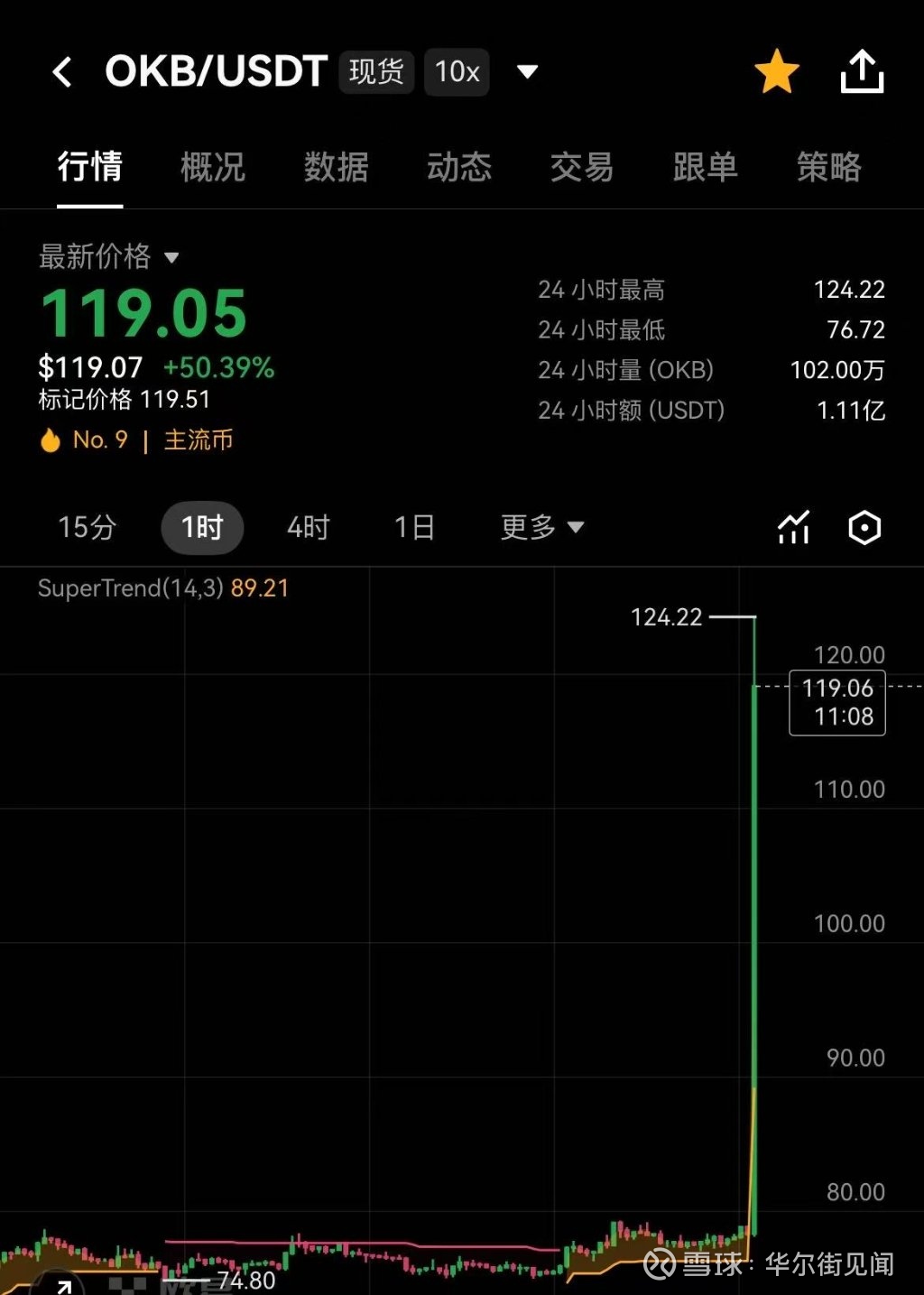消息后,OKX生态系统的原生加密货币OKB短线拉升涨超50%,现报价119美元。