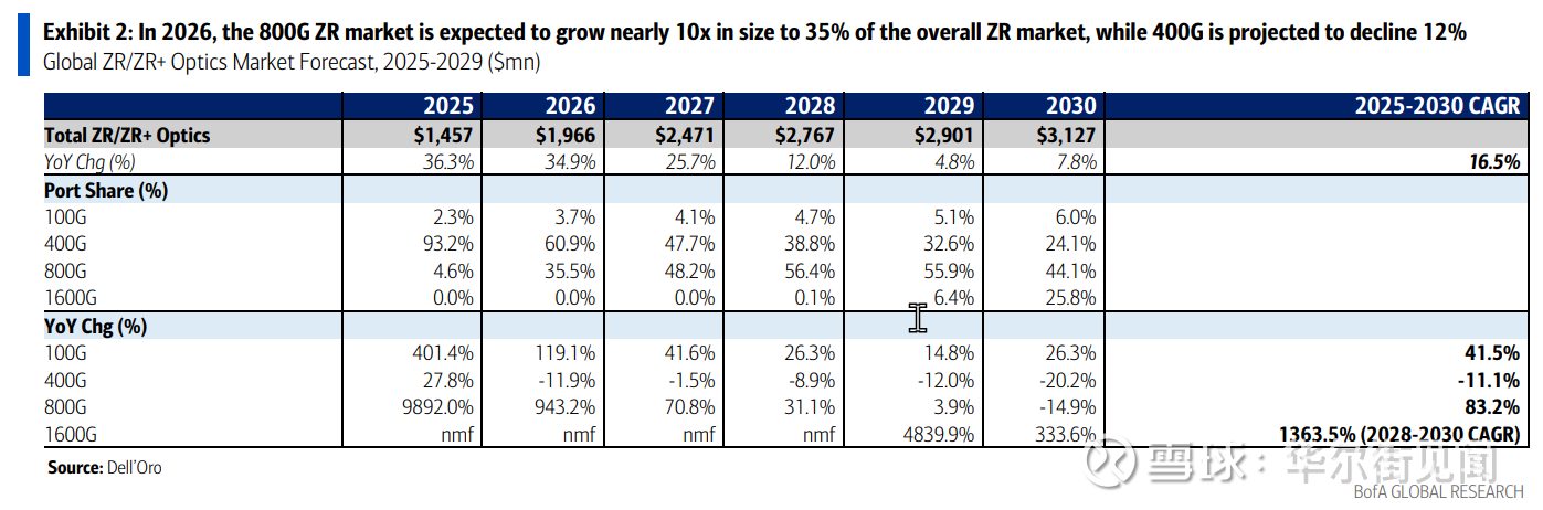 Dell’Oro数据显示,2025年400G ZR占市场93%,2026年占比将降至61%,800G占比将跃升至35%。