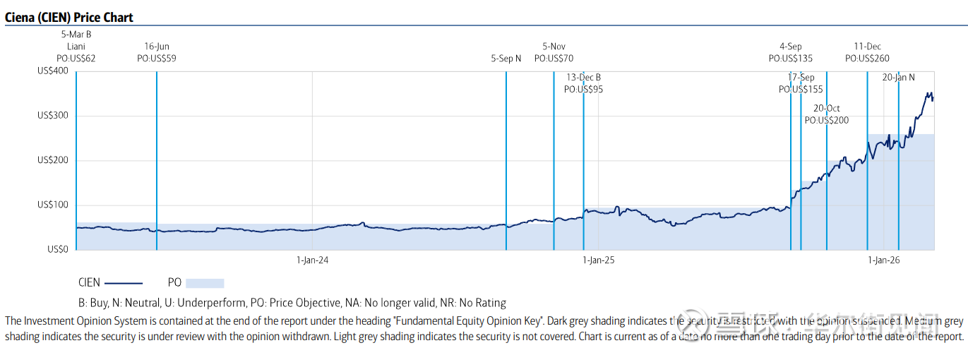 美银预计,Ciena有望在800G光模块市场继续扩大份额,其WaveLogic 6 Nano芯片采用3nm DSP工艺,在功耗方面具备明显优势。此外,Ciena还为Meta开发了DCOM数据中心管理系统,预计2026年将带来超过1亿美元收入。美银给予Ciena “买入”评级,目标价355美元。