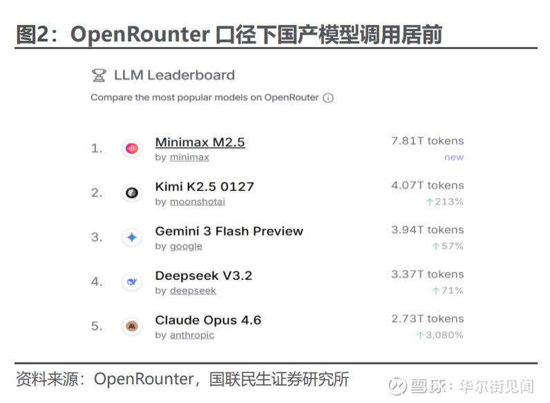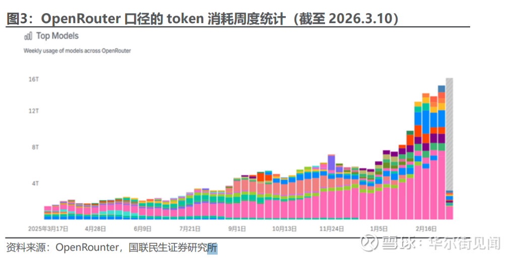 此外,在OpenClaw带动下,国产模型token消耗加速增长,OpenRouter数据显示近期大模型消耗量创新高,增长斜率陡峭,且中国模型token消耗量排名居前。Token消耗量的快速碰撞,亦是成本优势的证明。