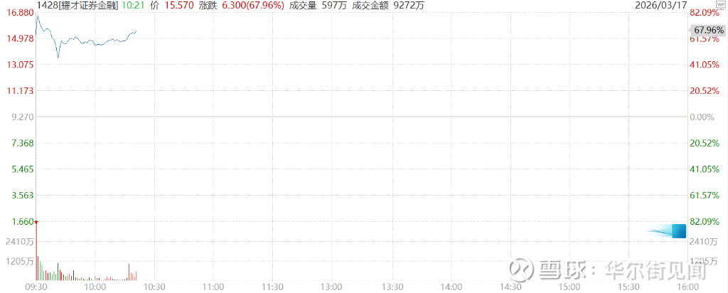公司股票于3月16日短暂停牌,并于3月17日开市起复牌。复牌前,耀才证券股价报9.27港元,市值约157.34亿港元。复牌后股价一度暴涨逾80%。