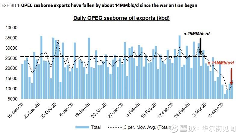 霍尔木兹全面封锁:每日供应缺口最高达1530万桶霍尔木兹海峡完全封闭对全球供应的潜在冲击规模巨大。据油轮追踪数据,OPEC原油及凝析油装载量已下降1380万桶/日,叠加中东产区液化石油气中断约150万桶/日,全面封锁情景下日均供应缺口高达1530万桶。3月因仅有部分装载受阻,实际冲击约为1000万桶/日。