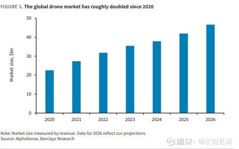 据追风交易台,巴克莱主题FICC研究分析师Zornitsa Todorova在最新报告中表示,过去五年全球无人机市场规模从约200亿美元(2020年)翻倍到400亿美元以上(2025年),预计2026年将到500亿美元,2035年的市场体量指向2500亿美元。