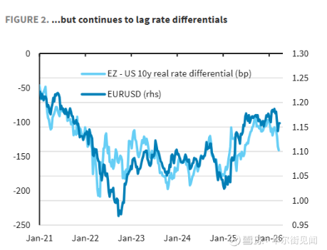 然而,美元的表现依然大幅落后于利率差距等传统基准指标。以欧元兑美元为例,按10年期实际利差衡量的公允价值约为1.10,但实际汇率却在1.15附近交易。