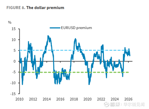 报告将“美元溢价”定义为:欧元兑美元汇率的实际水平,与基于10年期实际利率差、相对股票表现(MSCI美国/欧洲比率)等因素计算的“公允价值”之间的差额。