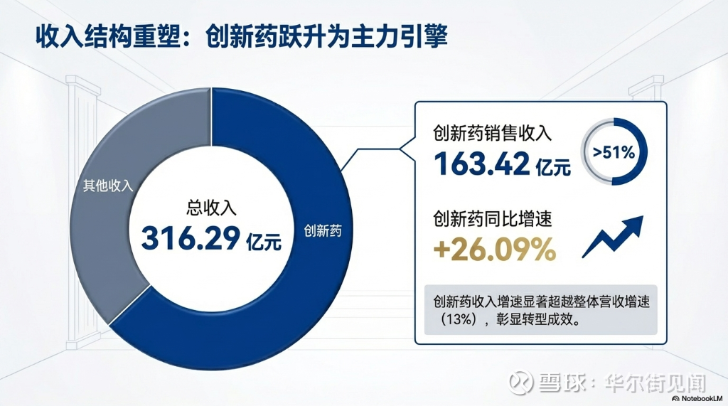 财报中最显著的亮点在于创新战略的成效加速兑现。2025年,公司创新药销售收入达163.42亿元,同比增长26.09%,占药品销售收入的比重提升至58.34%,已成为公司增长的核心动力。与此同时,创新药对外授权业务贡献收入33.92亿元,构成继自主销售之后,驱动业绩增长的又一重要引擎。