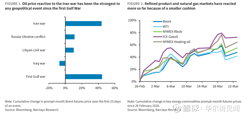 自2026年2月26日伊朗战争爆发以来,布伦特原油在短短25天内暴涨44%,美国汽油批发价(Rbob)上涨48%,美国柴油价格上涨51%,欧洲柴油价格上涨58%。