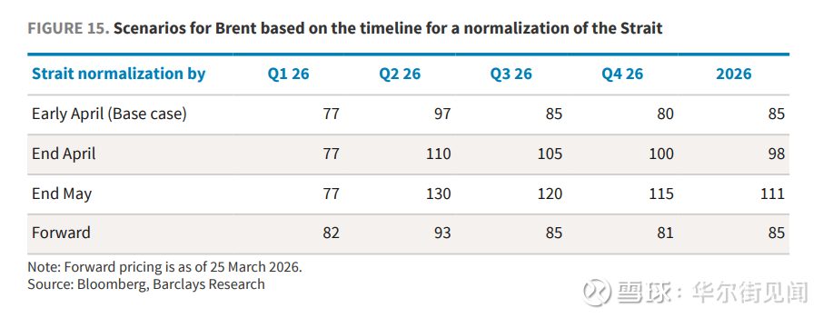 巴克莱认为,油价走势将在三个关键时间节点上将出现分叉:若霍尔木兹海峡在4月初恢复正常通行,巴克莱维持2026年布伦特原油均价85美元/桶的基准预测;若推迟至4月底,均价或重新定价至约98美元/桶;若拖延至5月底,均价可能达111美元/桶。每延误一天,累积的库存缺口就以雪球效应向后传导,推高价格中枢。