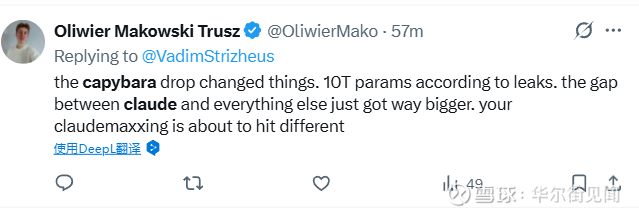 用户Oliwier Makowski Trusz则认为Capybara的发布改变了格局。根据泄露信息,参数量达到10万亿。Claude 与其他所有模型之间的差距刚刚被大幅拉开。