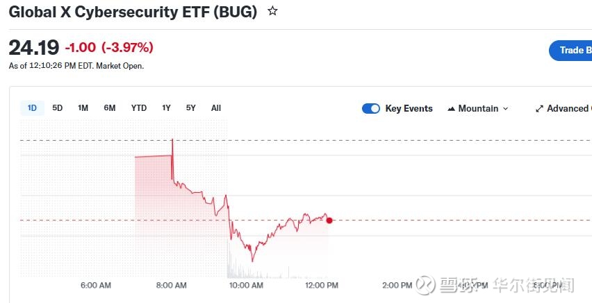 网络安全股ETF——Global X Cybersecurity ETF(BUG)早盘跌幅一度达6.1%,早盘尾声时,跌幅收窄到4%左右。